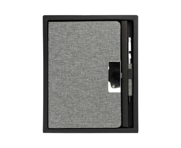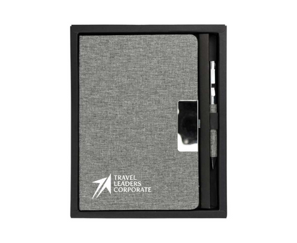 The Eco-Weave Writing Set is a mindful MTC (Memorable Tangible Connection) for clients and employees across the UAE, Saudi Arabia, Qatar, Kuwait, Oman, and Bahrain. This set thoughtfully combines a premium A5 size notebook with a matching ballpoint pen, both crafted with a commitment to sustainability. The notebook features a cover made from RPET fabric, which is ingeniously derived from recycled plastic bottles, and contains 96 sheets of high-quality 70g paper, perfect for notes and ideas. The accompanying pen also has an RPET fabric-wrapped barrel, complemented by a sleek metal chrome cap, clip, and tip, creating a cohesive and eco-friendly aesthetic.