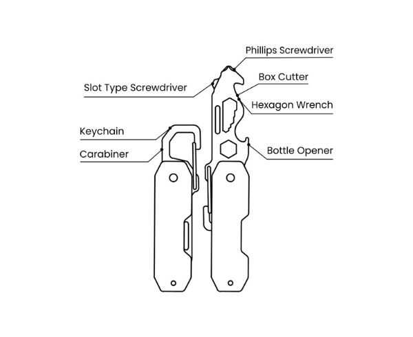 - 7-in-1 Functionality: Includes Phillips screwdriver, flathead screwdriver, box cutter, hex wrench, bottle opener, keychain, and carabiner.