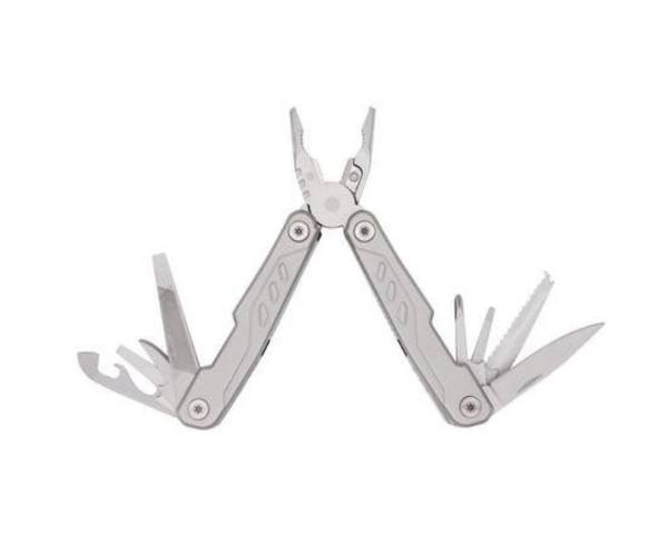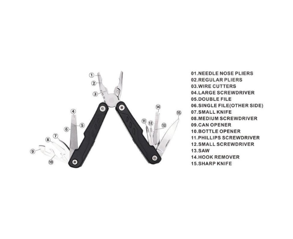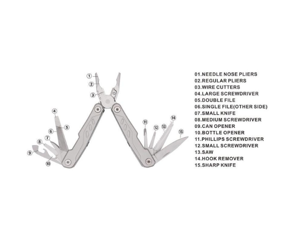 - 15-in-1 Functionality: Includes Needle nose pliers, regular pliers, wire cutters, large, medium & small screwdrivers, double file, single file, small knife, medium screwdriver, can opener, bottle opener, Phillips screwdriver, saw, hook remover, and sharp knife.